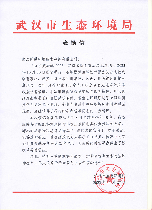 10月20日上午,“核護(hù)英雄城——2023”武漢市輻射事故應(yīng)急演練成功舉行。武漢網(wǎng)綠環(huán)境技術(shù)咨詢有限公司作為技術(shù)支持單位,全程負(fù)責(zé)演練的前期籌備、腳本編制、組織實(shí)施、現(xiàn)場(chǎng)導(dǎo)調(diào)等工作,獲得了武漢市生態(tài)環(huán)境局及指導(dǎo)觀摩領(lǐng)導(dǎo)的一致好評(píng)。